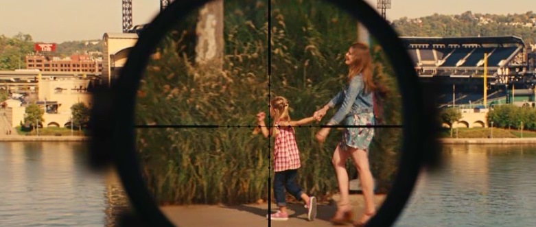 1. Дорога, 2. Провода, 3. Вид с бинокля или с любого оптического прибора, 4. В кадре всего два живых человека и между ними один мертвый, 5. Красноватого цвета одежда. 1 кадр- 15 дум